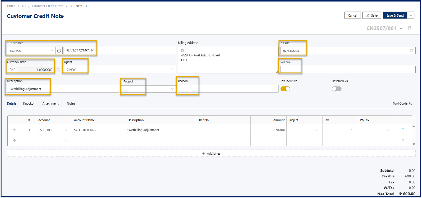 Global Description - Enter the general reason for the credit (e.g., “Overbilling Adjustment”).