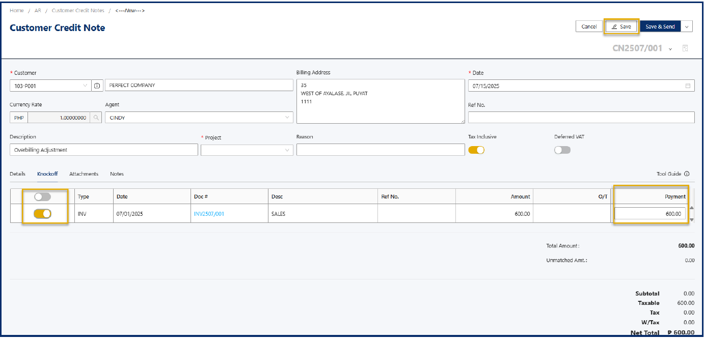 The credit note is now linked to the invoice, and the customer’s balance is updated accordingly.