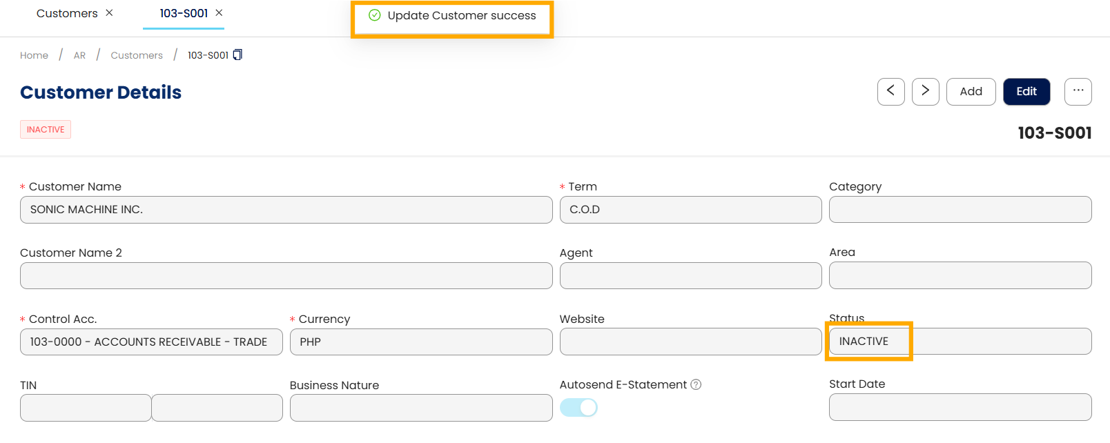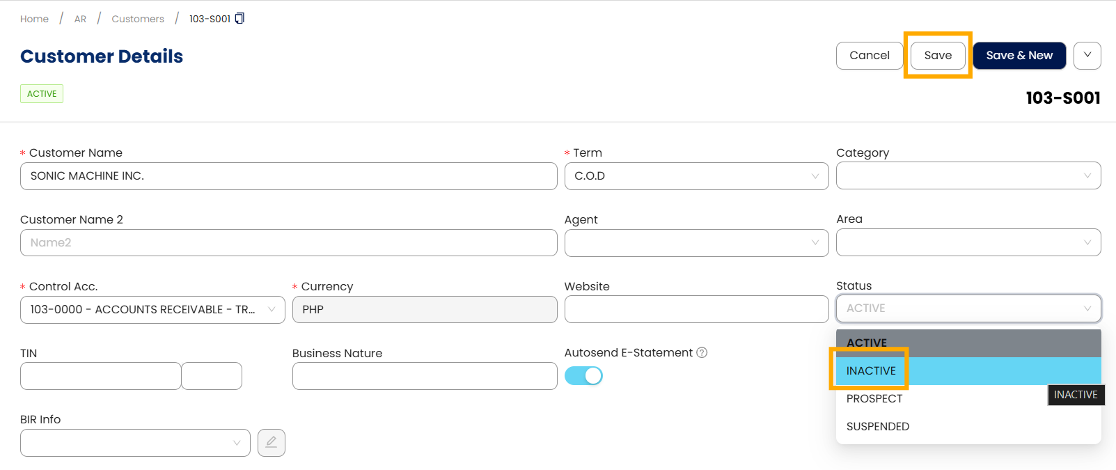 Let’s say you’re processing a new invoice, and previously, “Sonic Machine Inc.” would appear in the customer list. After setting their status to Inactive, they will no longer show up in the selection list for new transactions—reducing clutter and minimizing the risk of billing errors. Their past transactions, however, remain available in reports and historical records.