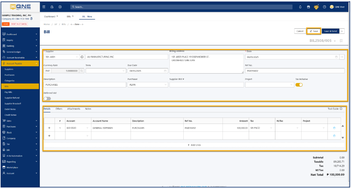 Recording Bill Entries is essential for tracking your company’s payables to suppliers or vendors. In QNE AI Cloud Accounting, the Bill Entries module under Accounts Payable allows users to record expenses that are not directly linked to purchases of inventory (e.g., utilities, services, rentals, etc.). This ensures accurate financial reporting and expense management.