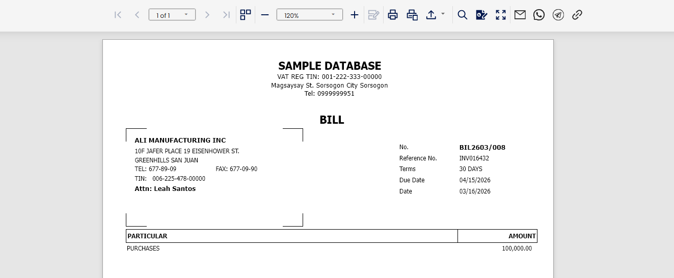 After saving, click the Preview button to view the Bills Voucher Form. This can be printed or exported as needed for documentation and audit.