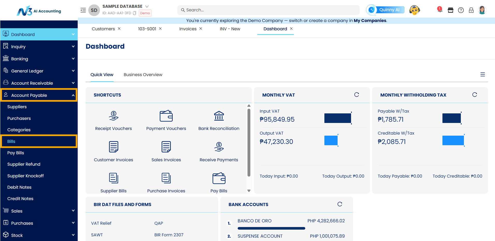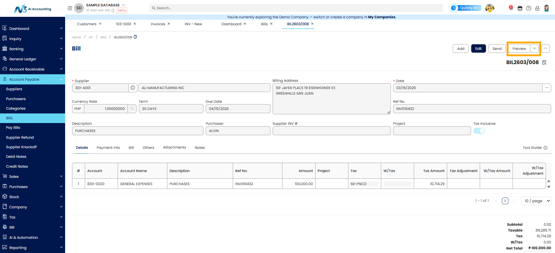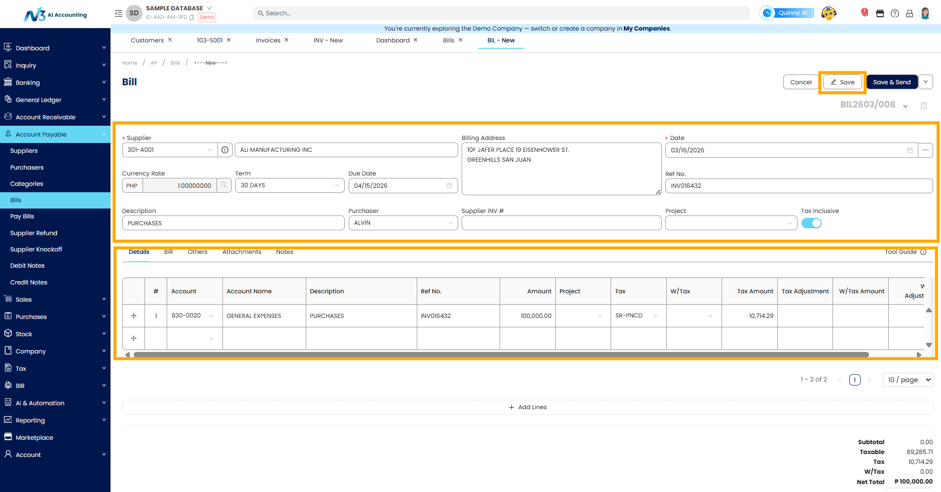 Recording Bill Entries is essential for tracking your company’s payables to suppliers or vendors. In N3 AI Accounting, the Bill Entries module under Accounts Payable allows users to record expenses that are not directly linked to purchases of inventory (e.g., utilities, services, rentals, etc.). This ensures accurate financial reporting and expense management.