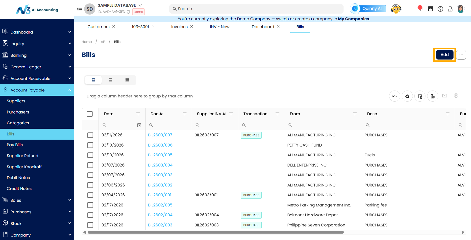 Once inside the Bills module, you’ll see a list of all previous Bill Entries transactions. Click the Add button to begin creating a new Bill entry.
