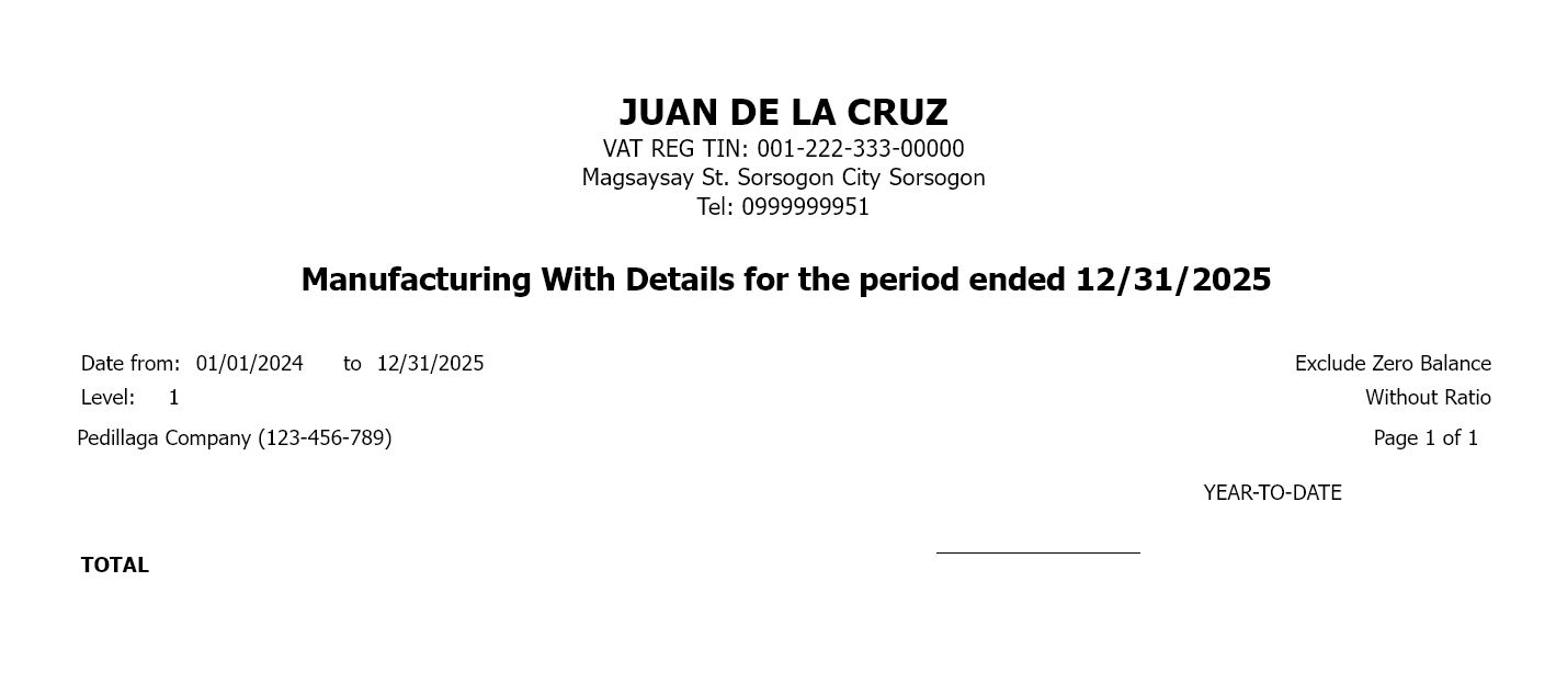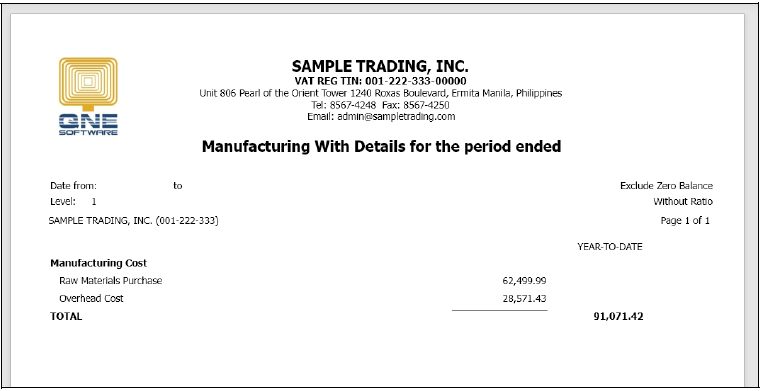 A cost accountant in a manufacturing company needs to present a cost analysis to management. By generating the Manufacturing Account with Details report, Ramon can show the breakdown of material consumption, direct wages, and factory overheads. This detailed view helps management understand production expenses and make decisions on cost control and pricing.