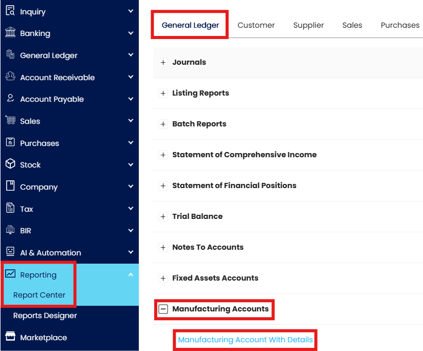 Navigate to Reporting > Report Center > General Ledger > Manufacturing Account with Details.