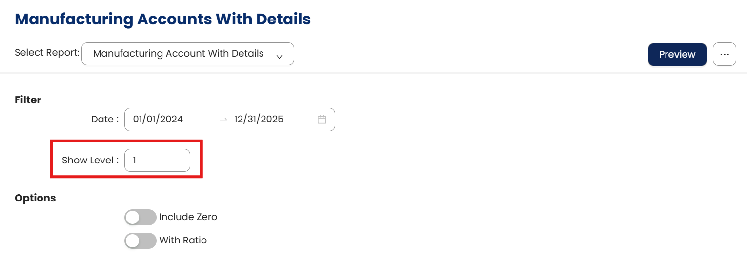 Use the Show Level option to control report detail. This indicates that account groups and sub-accounts are dependent on the level number