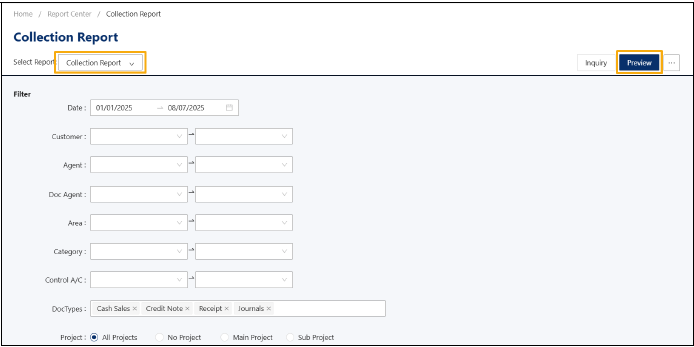 1. Go to Reporting > Report Center > Customer > Other Report > Collection Report.