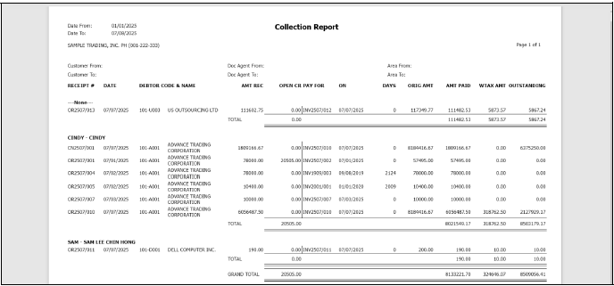 For example, the finance officer at XYZ Corporation needs to report on all customer payments received in June 2025. She opens the Collection Report, sets the filter from June 1 to June 30, leaves the customer field blank, and previews the report. Within seconds, she sees all receipts and their matching invoices, categorized by customer. She exports the report to Excel and attaches it to the monthly cash flow statement for management review.