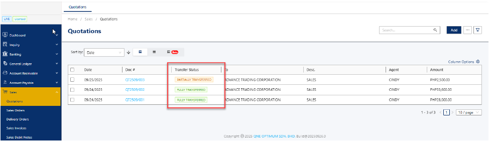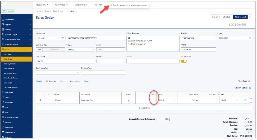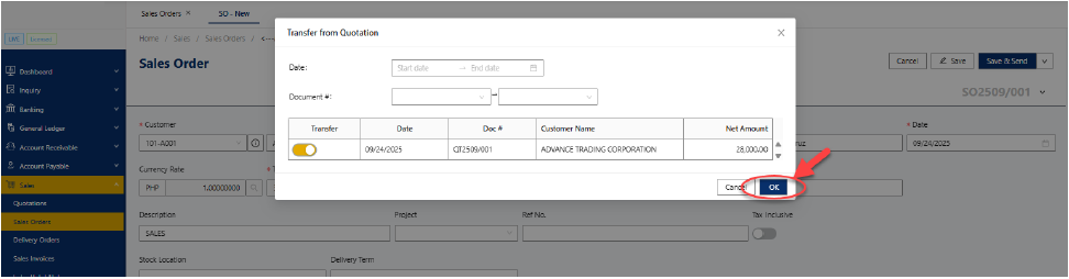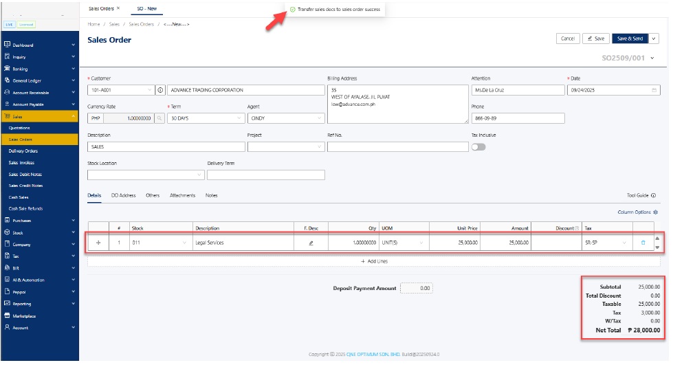 You quoted ₱25,000 for Legal Services under Quotation #QT2509/001. The customer accepts. Using the transfer function, you bring the quotation into a Sales Order. The Legal Services line with the same price and details is now part of SO #SO2509/001.