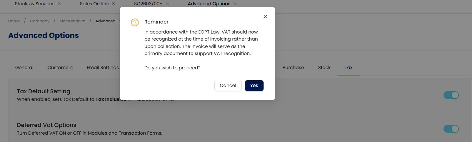 Note: It is recommended to keep Deferred VAT OFF after editing transactions to comply with the EOPT Law, which requires VAT recognition at the time of invoicing. Keeping it OFF ensures accurate reporting, audit readiness, and prevents unintended deferred postings.