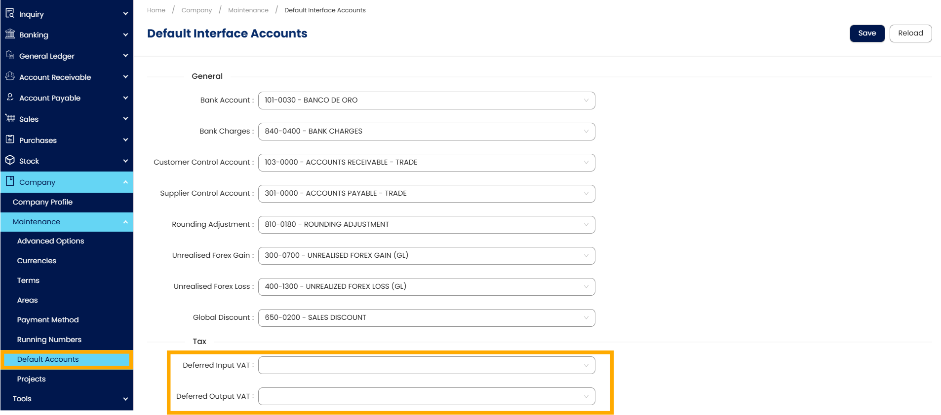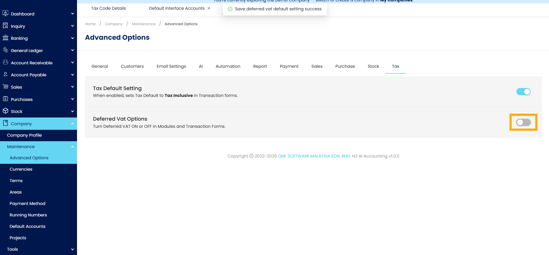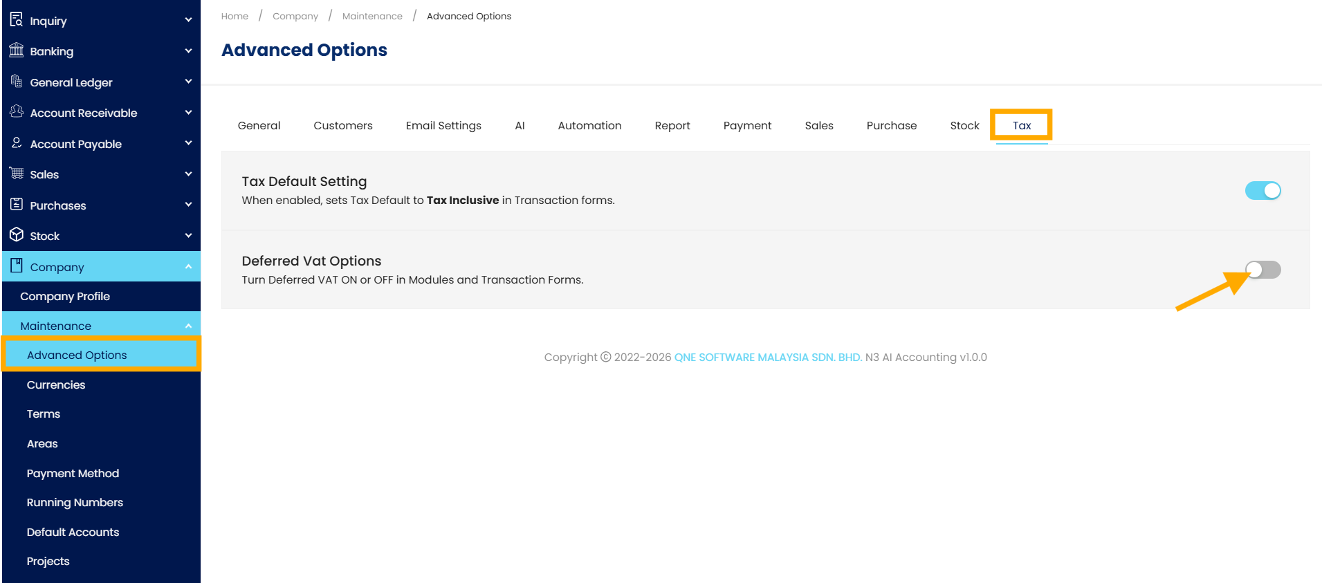 Go to Company > Maintenance > Advanced Options > Tax and there you will see the Deferred VAT Options panel with a single toggle to turn the feature ON or OFF.