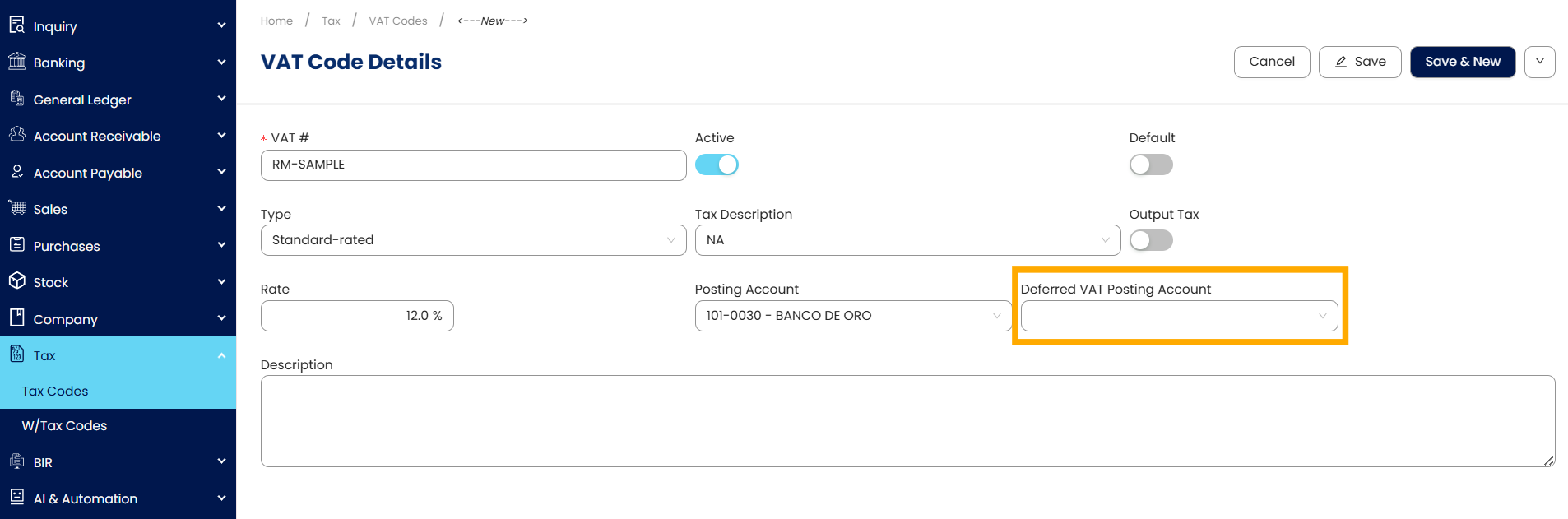 Vat Codes: For Standard-rated if Deferred VAT is ON, the Deferred VAT Posting Account field should be visible.