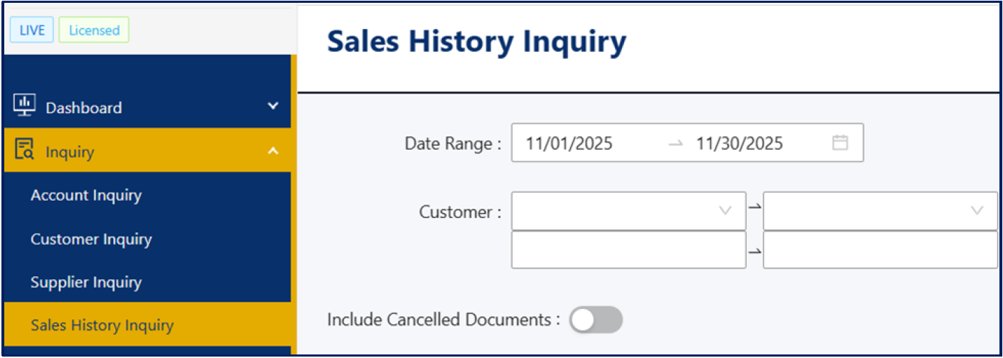 Important term: Sales History Inquiry — the inquiry screen or module where you select filters (such as Customer, Date Range, or Stock) to view a list of past sales transactions.