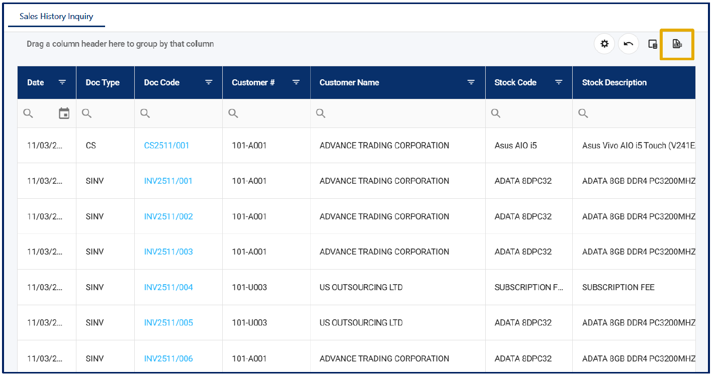 6. Once you see the full list of relevant sales transactions and confirm they align with your filter criteria, you have successfully viewed the sales history using Sales History Inquiry.