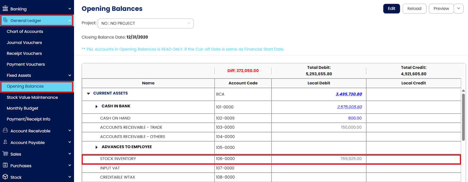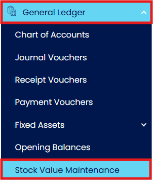 To ensure accuracy, you must first record the itemized Stock Opening Balance in the Stock module, then update the total stock value in the General Ledger through Stock Value Maintenance.