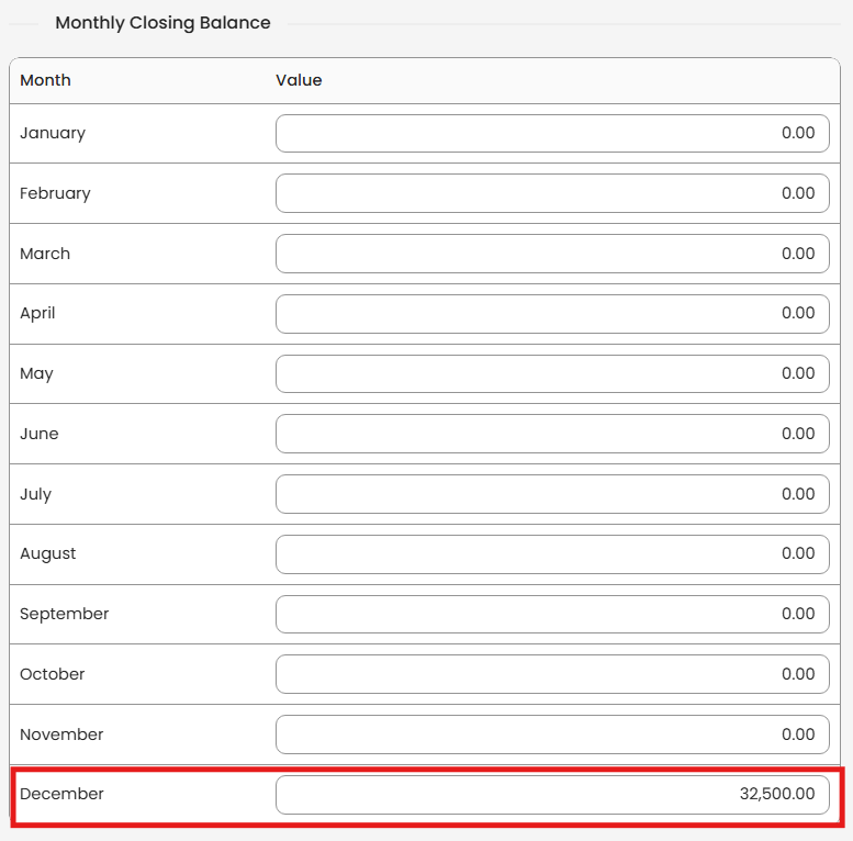 Enter the total stock value (e.g., ₱32,500) in the December field.