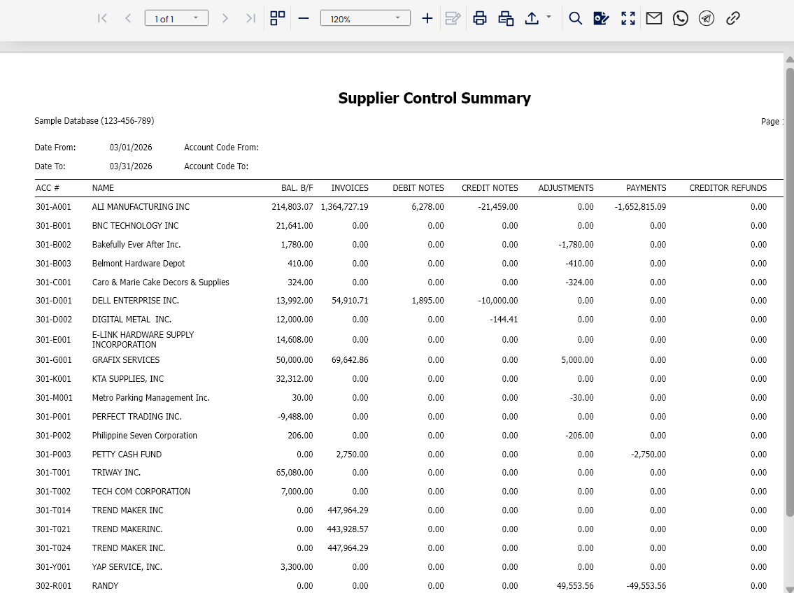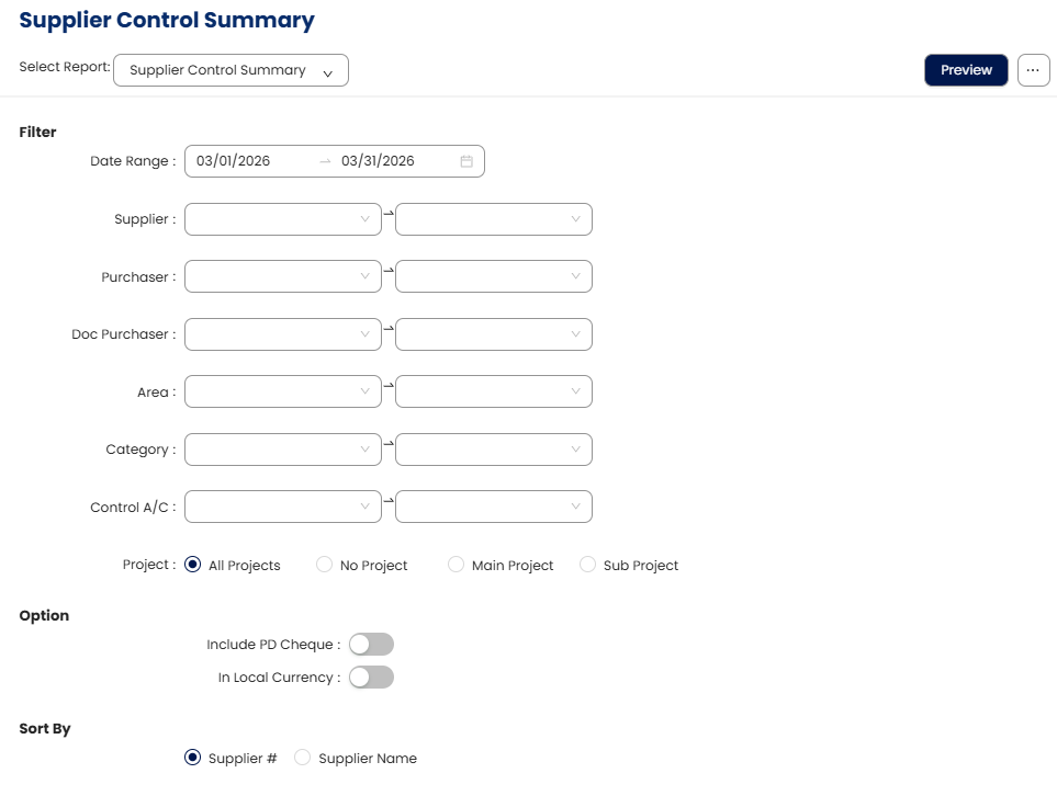 As part of month-end closing, an accounts payable officer needs to confirm that the outstanding payables recorded per supplier match the balances reflected in the related control accounts. Instead of reviewing each supplier ledger manually, the officer generates the Supplier Control Summary report to view all supplier balances in one summarized list. This makes it easier to identify inconsistencies and ensure accurate financial reporting.