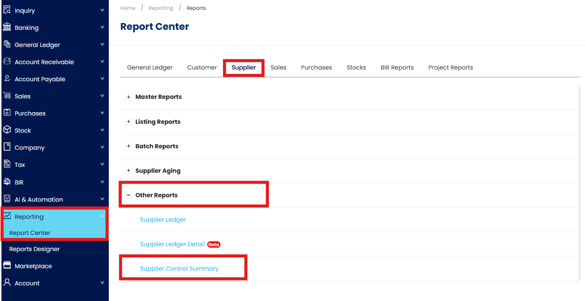 The Supplier Control Summary report provides a consolidated view of all supplier control account balances. It helps users monitor total payables, verify alignment between subsidiary ledger balances and their corresponding control accounts, and detect discrepancies before financial closing. This report is especially useful for accounts payable teams, purchasing departments, and anyone responsible for managing supplier liabilities.