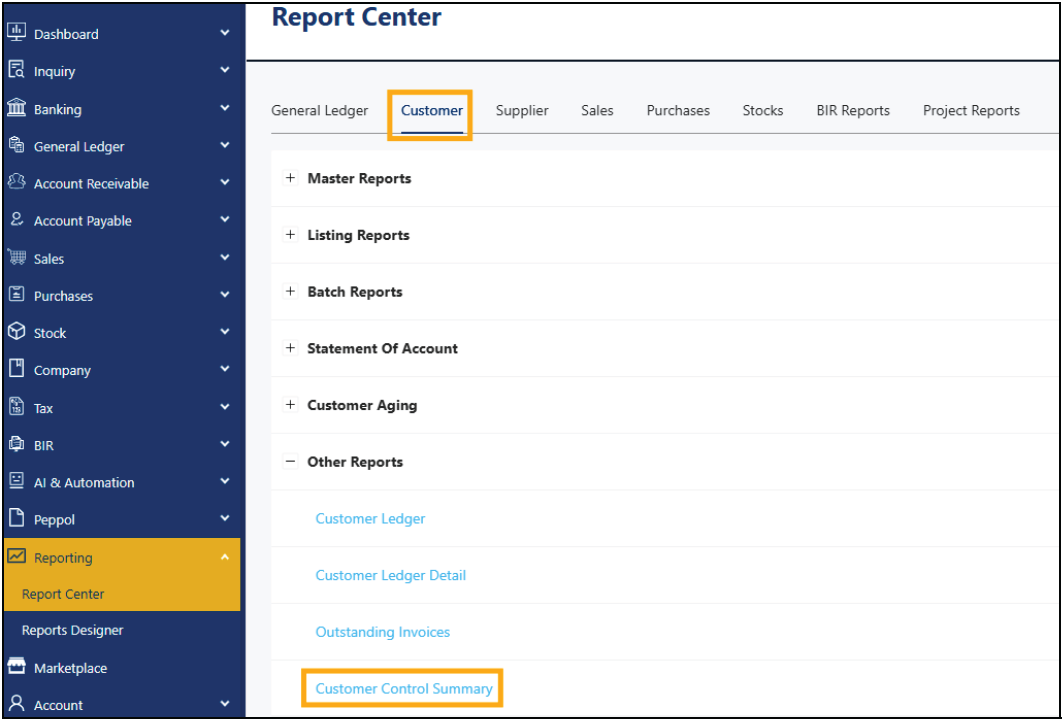 1. Go to Reporting > Report Center > Customer > Other Reports > Customer Control Summary