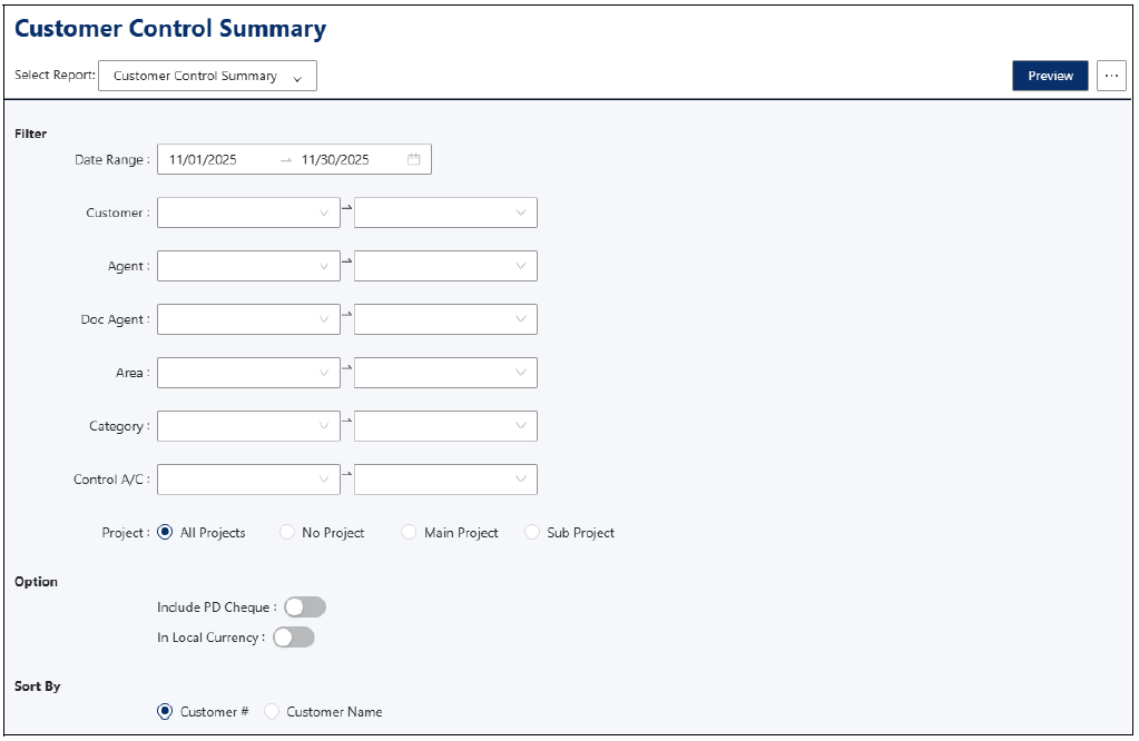 The Customer Control Summary report provides a consolidated view of all customer control account balances. It helps users quickly assess outstanding receivables, identify inconsistencies, and support accurate reconciliation. This report is especially useful for accounting staff, collection teams, and anyone monitoring customer balances across multiple control accounts.