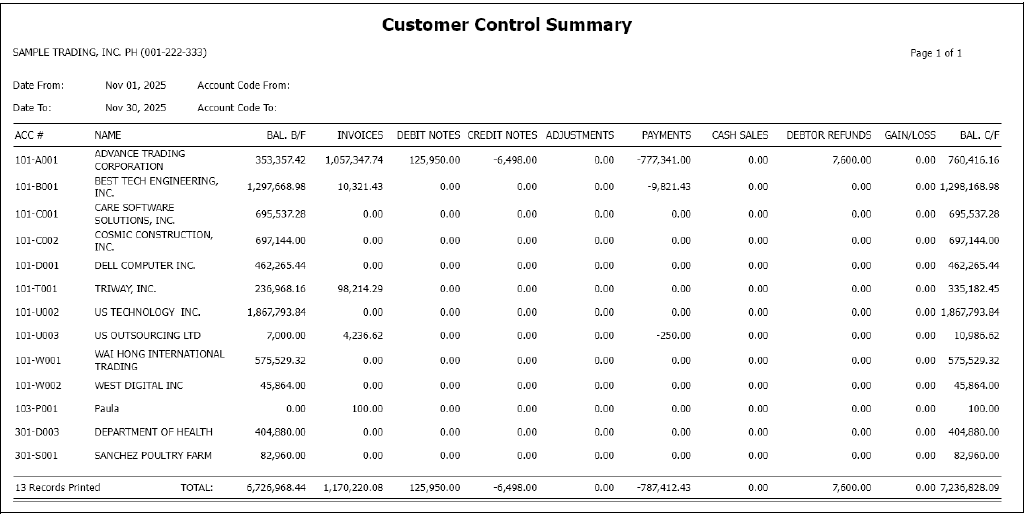 Before the month-end closing, an Accounts Receivable officer needs to verify that customer balances are correctly aligned with their designated control accounts. Instead of reviewing multiple detailed reports, the officer runs the Customer Control Summary report to view all customer balances at a glance—grouped and summarized by control account—ensuring a faster and more accurate reconciliation process.