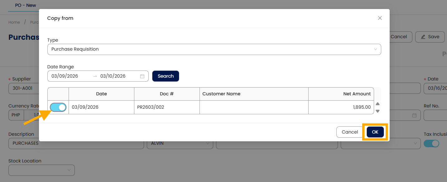 Filter the date range > Click Search > Select the document > Click OK.
