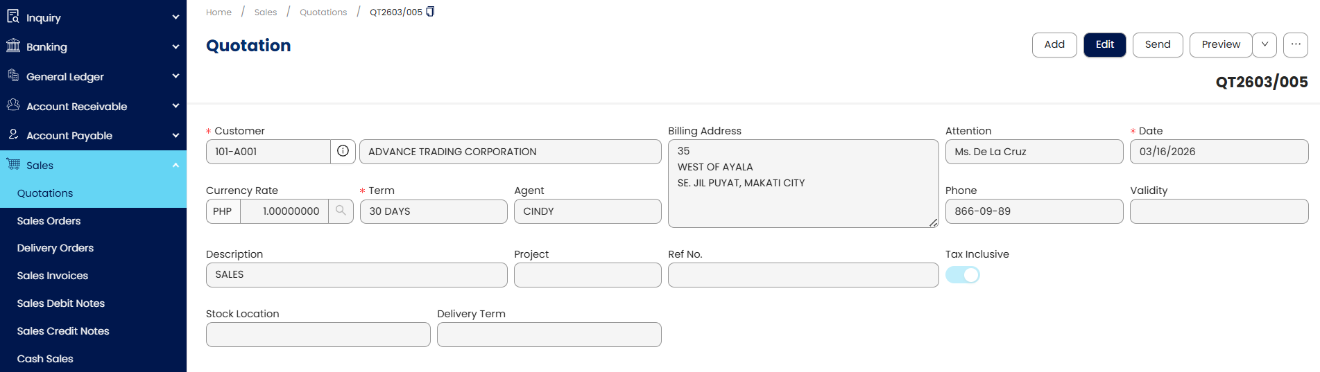 Sales: Quotation, Sales Order, Delivery Order, Sales Invoice, Sales Debit Note, Sales Credit Note, Cash Sales