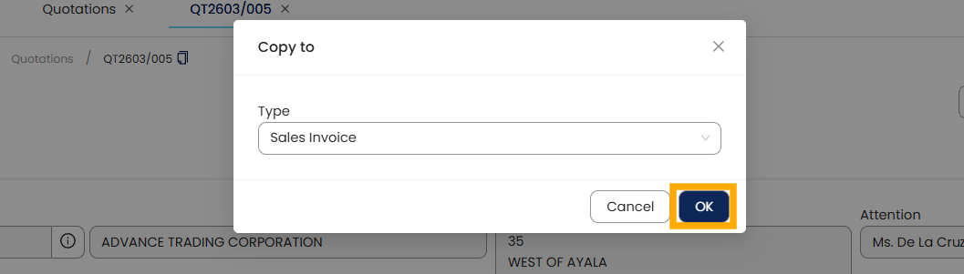Select the next document to create (e.g. Sales Invoice) > Click OK.