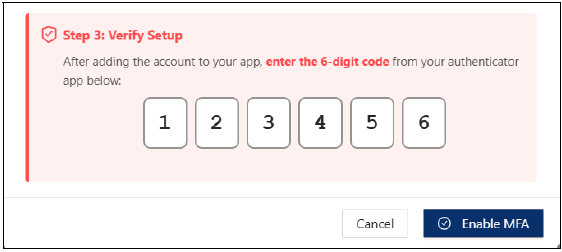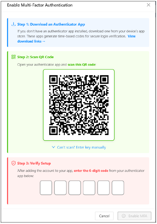 Under Multi-Factor Authentication, click Enable MFA. This will open a guide on how to enable the Authenticator App. Follow the instructions and enter the 6-digit code from the authenticator.