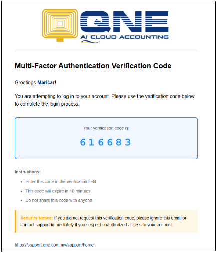 Multi-Factor Authentication (MFA) enhances account security by requiring a verification code in addition to your password. This prevents unauthorized access even if your login credentials are compromised. QNE AI Cloud Accounting supports both authenticator app–based codes and email verification to give users flexibility and added protection.