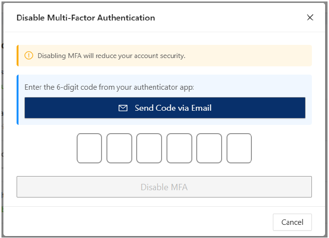 Note: Enabling or disabling Multi-Factor Authentication triggers a notification email to the user. This security feature is only available from the Essential Plan up to higher-tier plans.