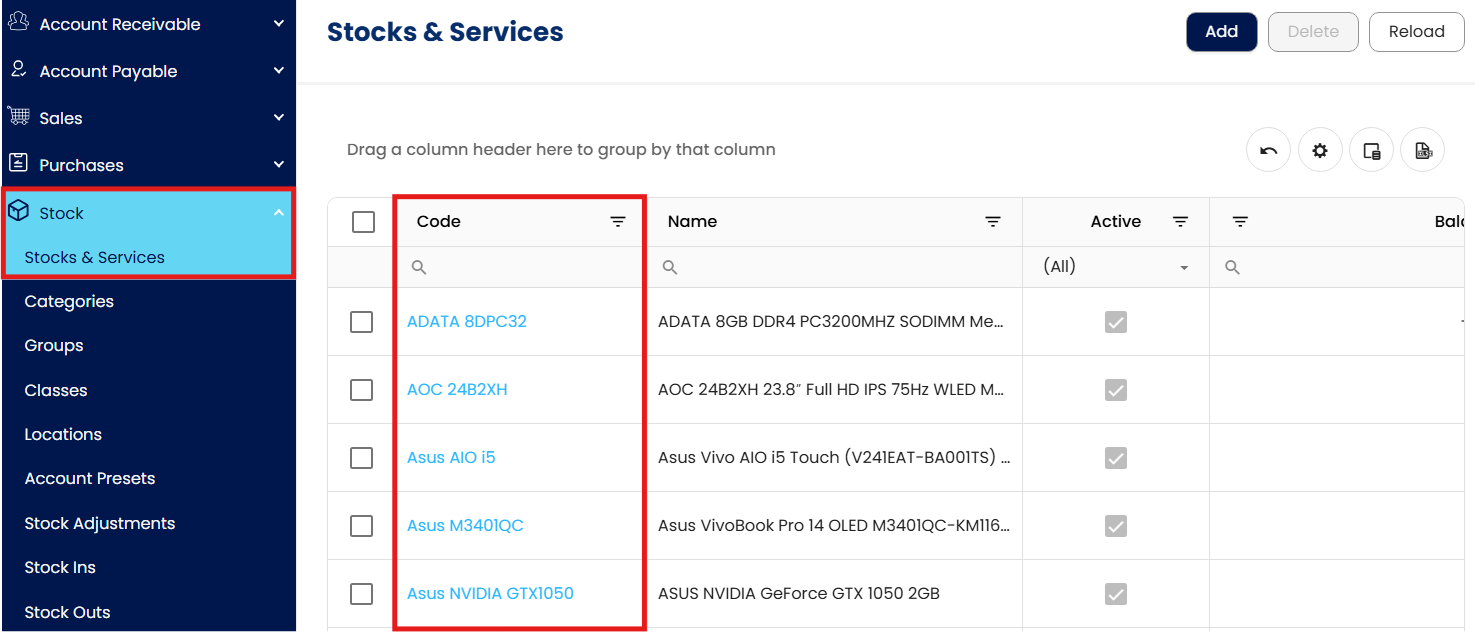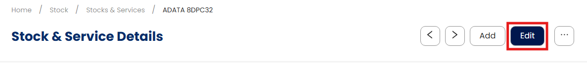 Go to Stock > Stocks & Services, then select the code of the stock item you want to update.
