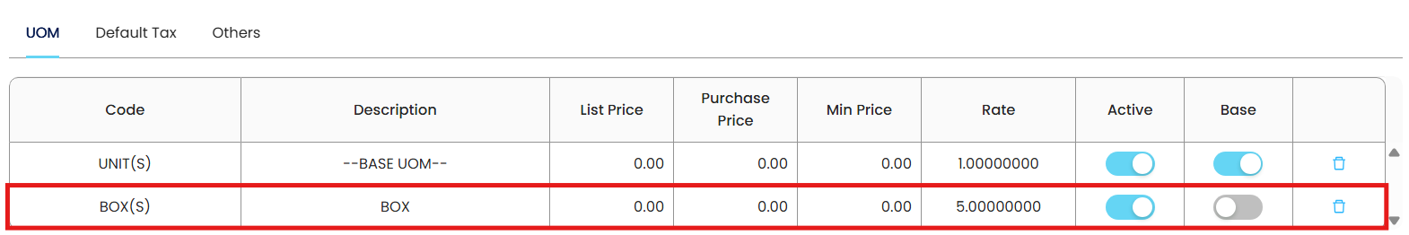 Example: If 1 BOX = 5 UNIT(S), enter 5.00000000Active – Turn on to make the UOM available for use.