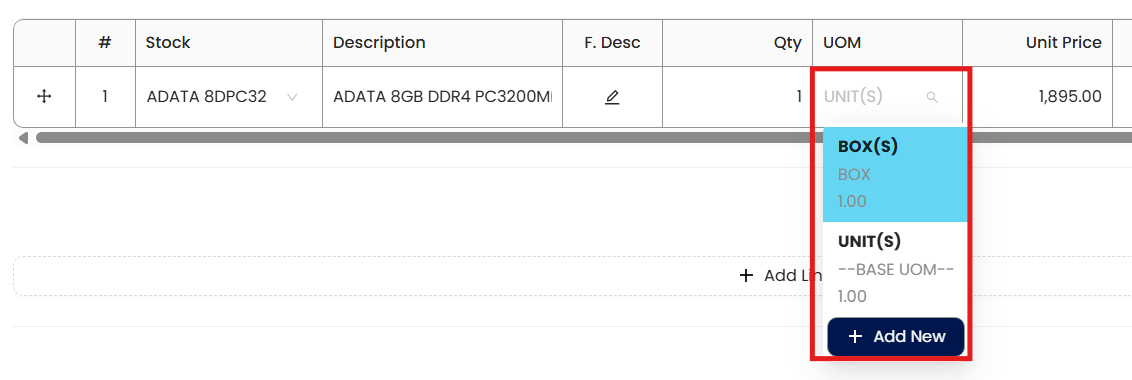 A computer parts distributor stocks the item ADATA 8GB DRR4 RAM in UNIT(S) (Base UOM). However, suppliers deliver them in BOX of 5 units. To avoid manual conversions, the Inventory Manager adds “BOX” as an additional UOM with a conversion rate of 5, so purchasing staff can simply enter the quantity in BOX while the system handles the internal conversion.