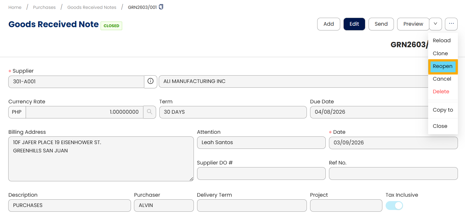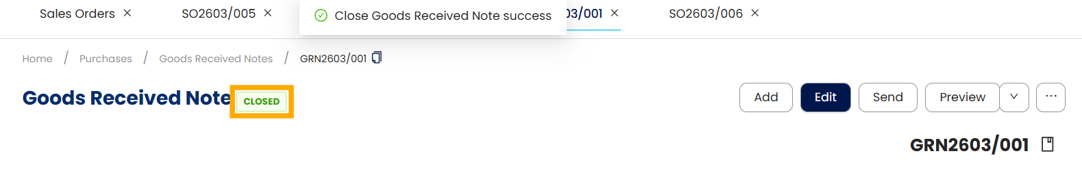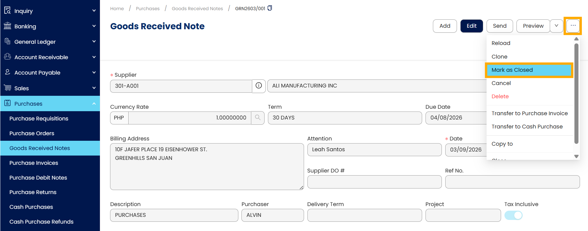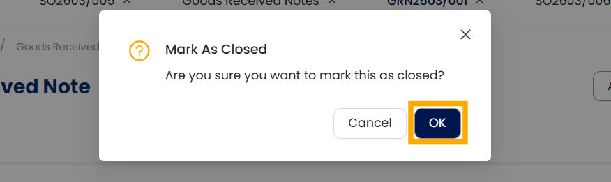 Open the Purchase transaction (e.g., Goods Received Notes) to be closed. Click the tri-dot button > Mark as Closed.