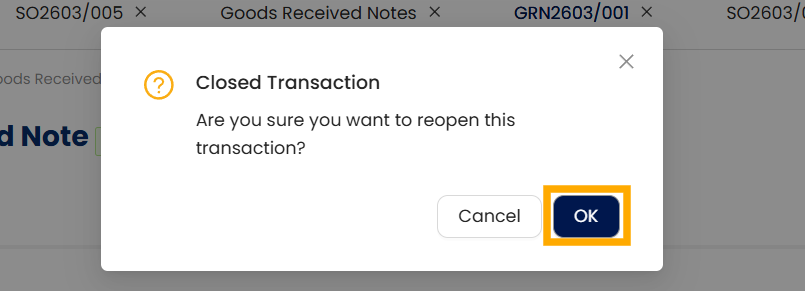 Click OK to proceed with reopening the transaction.