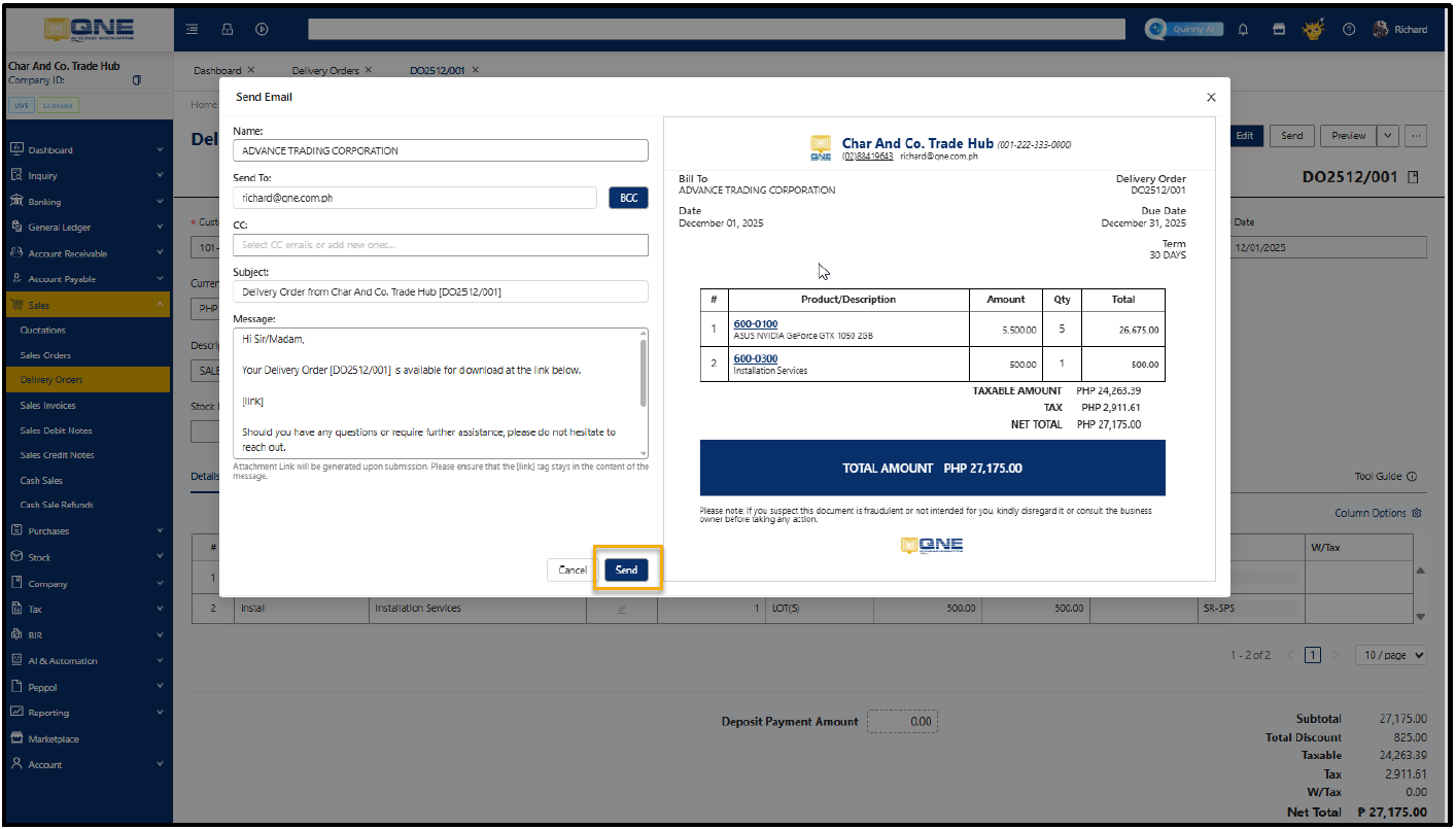- Send the Delivery Order and track its status within QNE AI for follow-up.