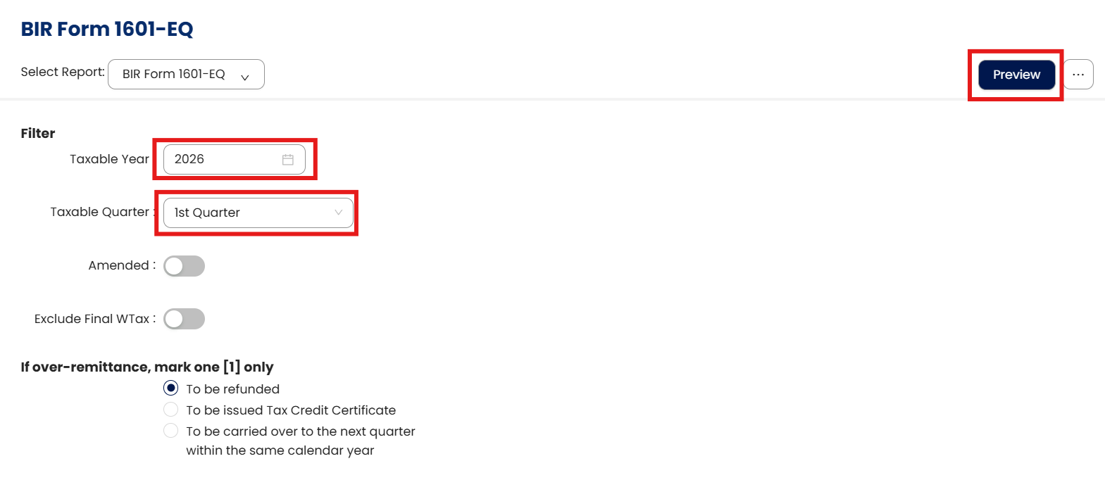 For Amended Returns, Over-remittance, and Penalties, ensure these entries are properly recorded under BIR > Remittance of EWT before generating the report.
