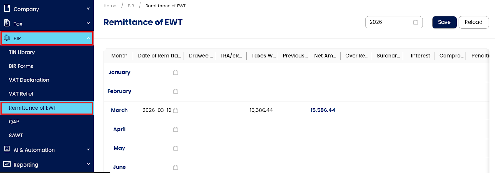 AC Trading has already filed its monthly Expanded Withholding Tax (EWT) for January and February. As March closes, the accounting team must now generate the quarterly BIR Form 1601-EQ covering January to March to prepare for submission to the BIR.