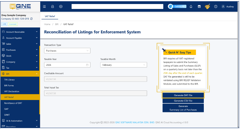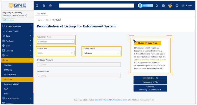 In QNE Cloud Accounting, generating the SLSP DAT and CSV files is automated through the BIR Module. The system compiles the necessary VAT transactions and prepares the files in the correct format for submission.