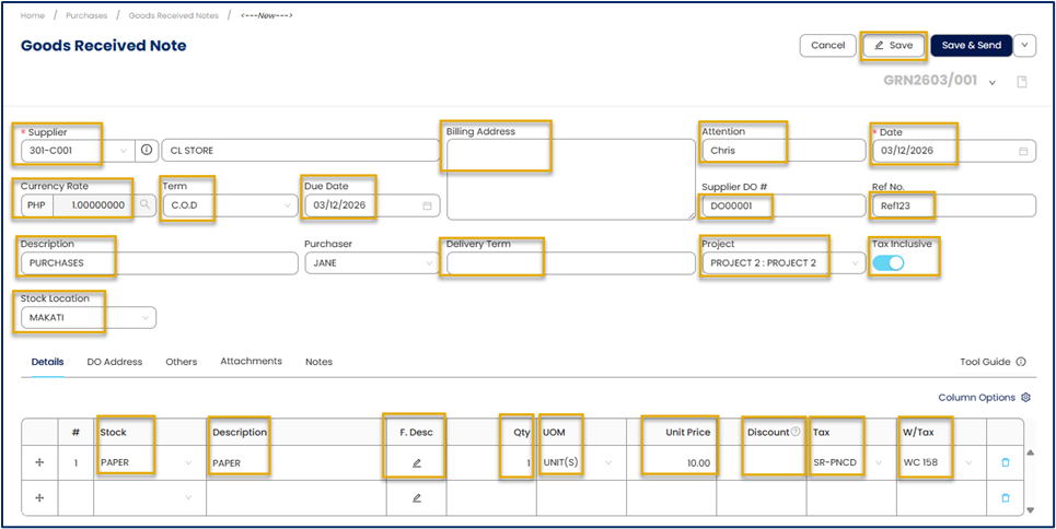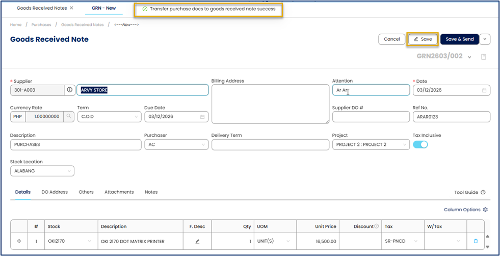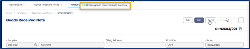 In N3 AI Accounting, creating a GRN updates inventory records and provides a verified reference for the accounts payable team before processing supplier invoices.