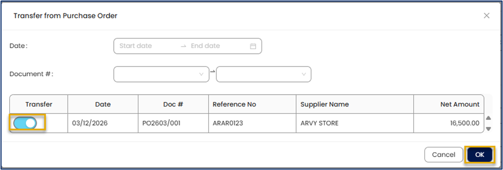 3. Toggle on the Purchase Requisition or Purchase Order you want to transfer