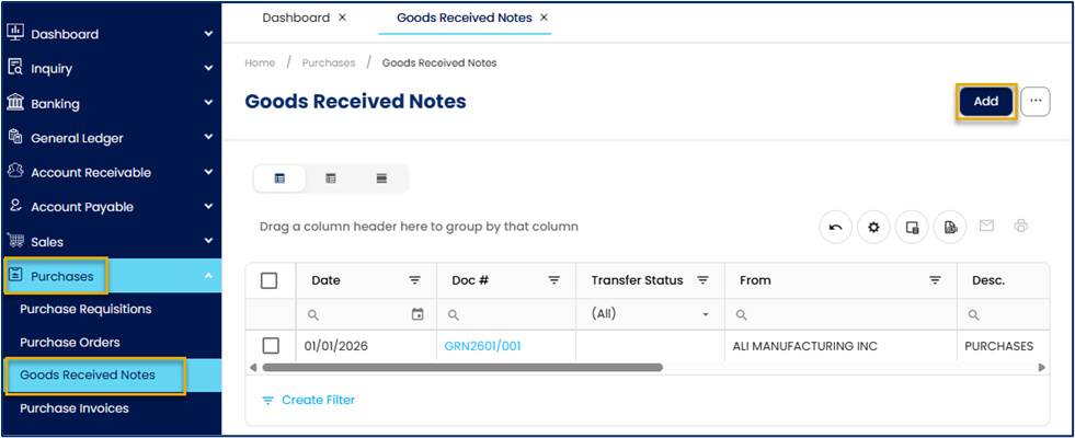 After clicking Add, you can create the Goods Received Note using one of the following methods: