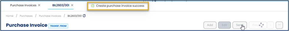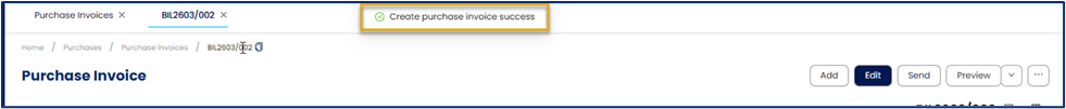 A confirmation message appears indicating “Create purchase invoice success”, confirming that the purchase invoice has been successfully recorded.