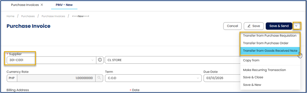 Option 1: Create a Purchase from a Purchase Requisition or Purchase Order or Goods Received Note