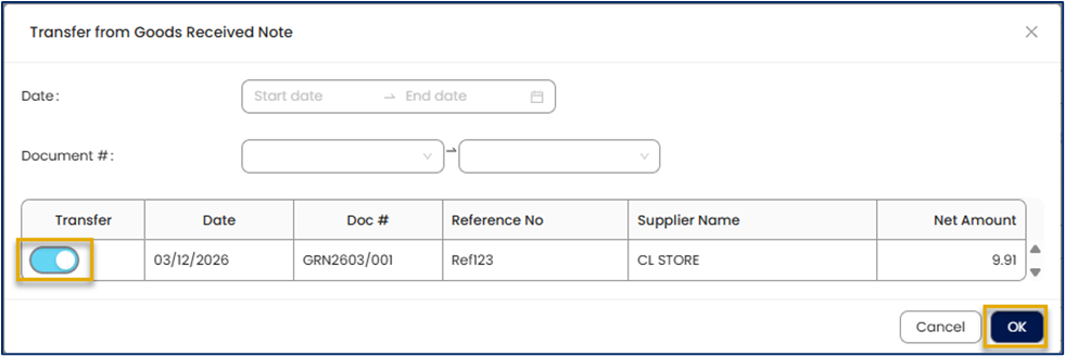 3. Toggle on the Purchase Requisition or Purchase Order or Goods Received Note you want to transfer