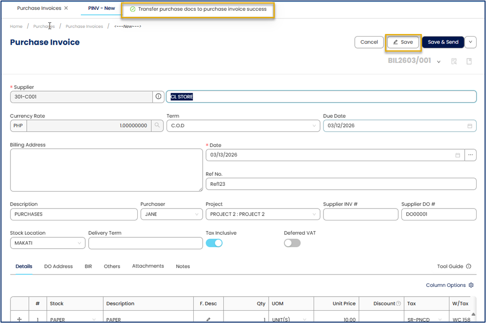 A confirmation message appears: "Transfer purchase docs to purchase invoice success!”