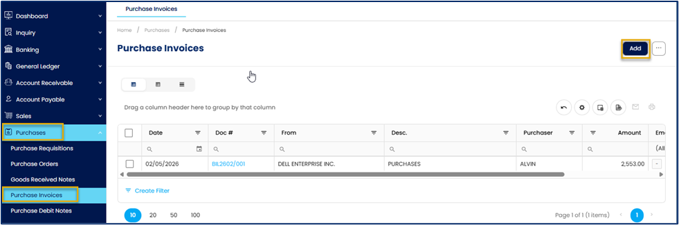 After clicking Add, you can create the Purchase Invoice using one of the following methods:
