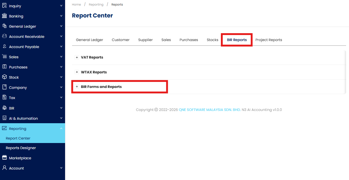 1. Go to Reporting > Report Center > BIR Reports > BIR Forms and Reports.