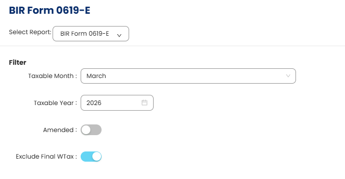 Using the BIR Form 0619-E report, users can generate the form based on recorded Expanded Withholding Tax transactions for a selected Taxable Month and Taxable Year. This allows users to review withholding totals, verify tax amounts, and prepare the report before filing or remitting to the Bureau of Internal Revenue (BIR).